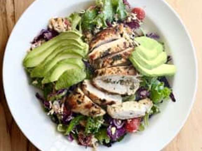 Mixed Greens & Red Cabbage tossed with Chopped Bacon, Marinated Tomatoes, Cheddar Cheese, Avocado, Chopped Egg & Crispy Onions in a Creamy Artichoke Dressing, topped with Grilled Chicken Breast
